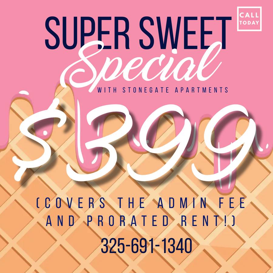 $741 . 1 Bed 1 Bath . 648 Sq.Ft Stonegate Apartments Address: 5125 Fairmont Street Abilene, TX 79605 DESCRIPTION Stop in and take a tour of this gorgeous one-bedroom, one-bathroom apartment from Stonegate. The kitchen has a pantry, the bedroom has a walk-in closet, and the living room has a wood-burning fireplace! You can host picnics by the grilling area, parties in the clubhouse, or playdates on the playground or bark park. Schedule a tour with the leasing office now. FLOORPLAN/UNIT FEATURES Large Walk-In Closet(s) Dishwasher Stackable washer/dryer conn. Garbage disposal Refrigerator Fireplaces in Select Homes Private Patio Fireplaces in Select Homes LEASE TERMS 6,7,8,9,10,11,12,13,14,15,16,17,18 6-11 month lease terms subject to approval & short-term lease fee. OFFICE HOURS Monday 8:30am to 5:30pm Tuesday 8:30am to 5:30pm Wednesday 8:30am to 5:30pm Thursday 8:30am to 5:30pm Friday 8:30am to 5:30pm CALL US TODAY!