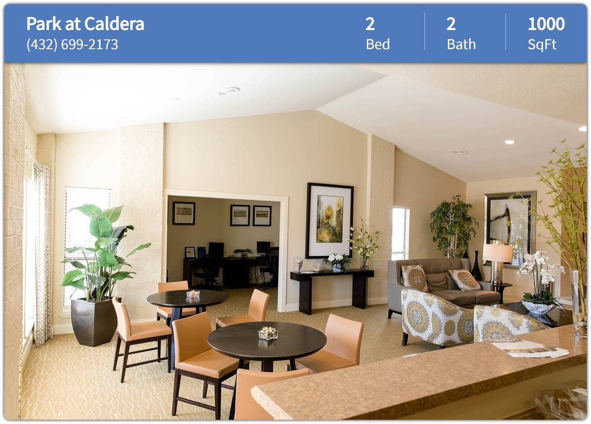 The life you deserve is waiting for you at The Park at Caldera Apartments in Midland, Texas. Close to Midland College, Midland Park Mall, and with fast access to Interstate 20 our Caldera Boulevard location puts you close to all the popular spots in Midland and the surrounding cities. Give us a call and schedule your personal tour today!Pet Policy: Dogs and Cats Allowed: We are a pet-friendly community! No weight limit observed. Max 2 allowed, One time Fee $200.00, Rent $20.00. Pit Bull's, Rottweiler's and Chow's (all municipality laws apply to other breeds) and any mix more than 20% of these breeds are prohibited.UNIT FEATURES: ● Ceiling Fans● Convenient Live-Work Spaces● Engineered Wood Style Flooring● Extravagant Walk-In Closets● Fireplaces● Linen Closets● Outside Storage● Private Patios and Balconies● White Custom Cabinetry● A Range of Expertly Designed Floorplans● Elegant Built-In Bookcases or Display Niche● Expansive Vaulted Ceilings in Select Units● Faux Wood Style Blinds In Select Units● Full Size Washer/Dryer Connections In Select Units● Generous Pantries with Wood Shelving● Open Concept Serving Bar in Kitchen● Upgraded Designer Interior ColorsCOMMUNITY FEATURES: ● Bark Park● Covered Reserved Parking● Monthly Resident Events● Outdoor Grills with Open-Air Dining● Package Acceptance● Package Receiving● Playground● Resident Lounge● Resident Lounge with Wi-Fi, TV's & Entertaining Spaces● Short Term Lease● Bi-Lingual Team Members● Business Lounge with Desktop Stations● Complimentary Hospitality Bar (Coffee Bar)● Convenient to Fine Shopping and Dining● Convenient to Public Transportation● Maintenance On-Site● Outdoor Grills with Open-Air Dining● Preferred Employer Program● Property Manager On-Site● Resort Style Pools with Outdoor Entertainment SpaceCONTACT US TODAY!Park at Caldera3100 Caldera Blvd Midland, TX 79705Phone: