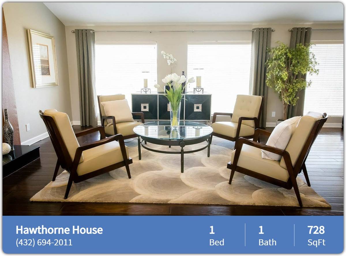 Hawthorne House2811 W Loop 250 N Midland, TX 79705Pricing: $1081 - $3346/MonthBedrooms: 1 Bathrooms: 1 Square Footage: 728 sq ft