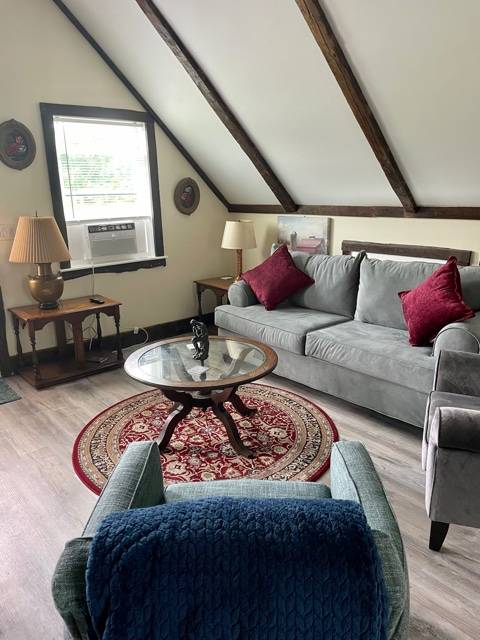 Carriage House with Loft Bedroom. Country setting. Mountain/valley views. Fully furnished. All utilities included. Verizon Fios internet provided, New Appliances. Washer/Dryer in unit. Parking on site. Lawn/garden maintenance, snow plowing and trash disposal included. King size bed in loft. Guest queen size futon in living area. Outdoor, upper deck with Weber gas barbecue. Deck and lawn furniture. Perennial gardens. Security and references required.